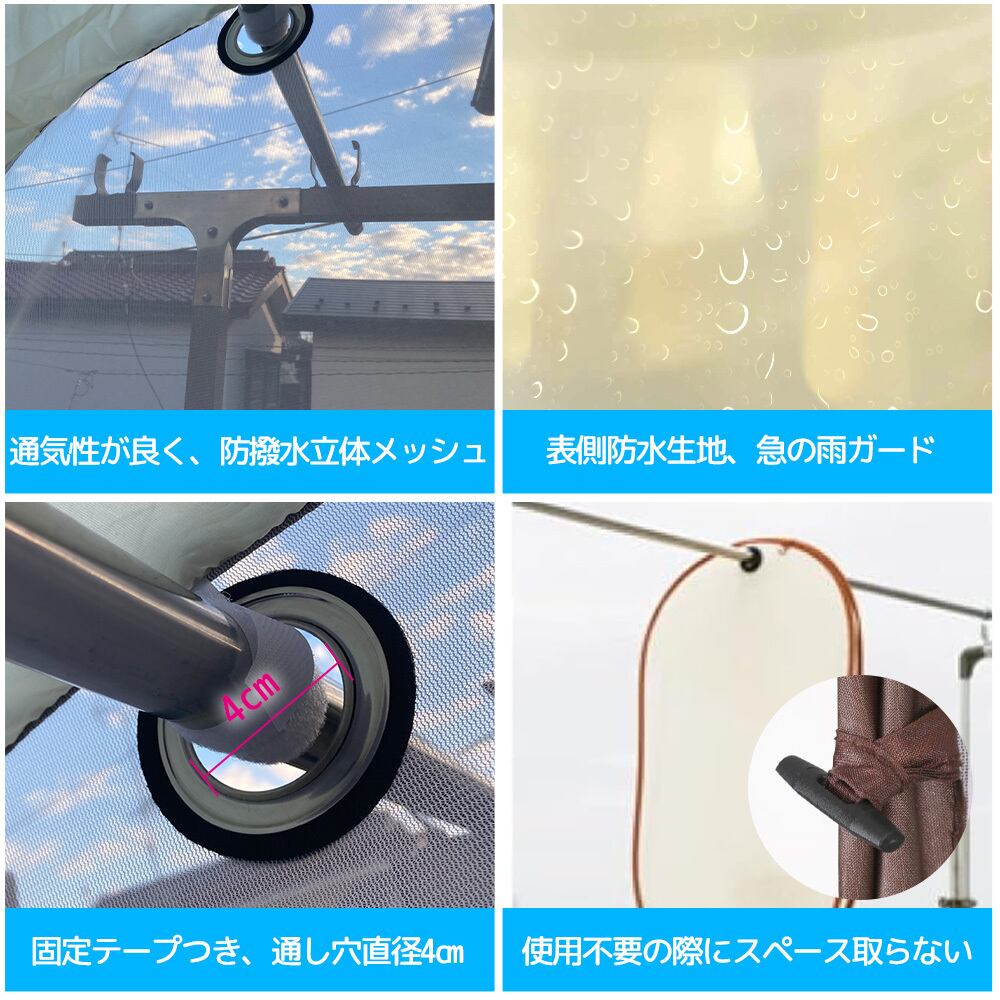■【防撥水素材、急な雨でも安心!】防撥水素材プラス両側の細かい立体メッシュ、ベランダやお庭での洗濯物干しに、雨の侵入を防ぎ、汚れ防止できます。花粉対策、紫外線対策にも役たつ!あなたの洗濯物をしっかりガード!